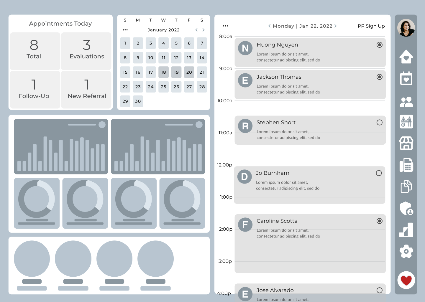 A focused, metrics-first dashboard for physical therapists and clinic staff